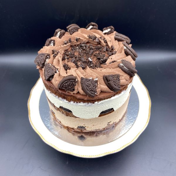 Blat de cacao, mousse delicat de ciocolata cu lapte, mousse delicat de ciocolata alba, biscuiti oreo